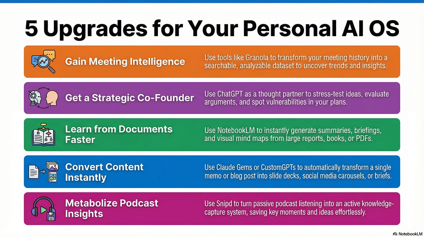 Here are five practical, high-impact tools to add to your personal AI Operating System. I use them every day to save hours a week and produce better outputs and outcomes. At least one of these will immediately upgrade the way you work.