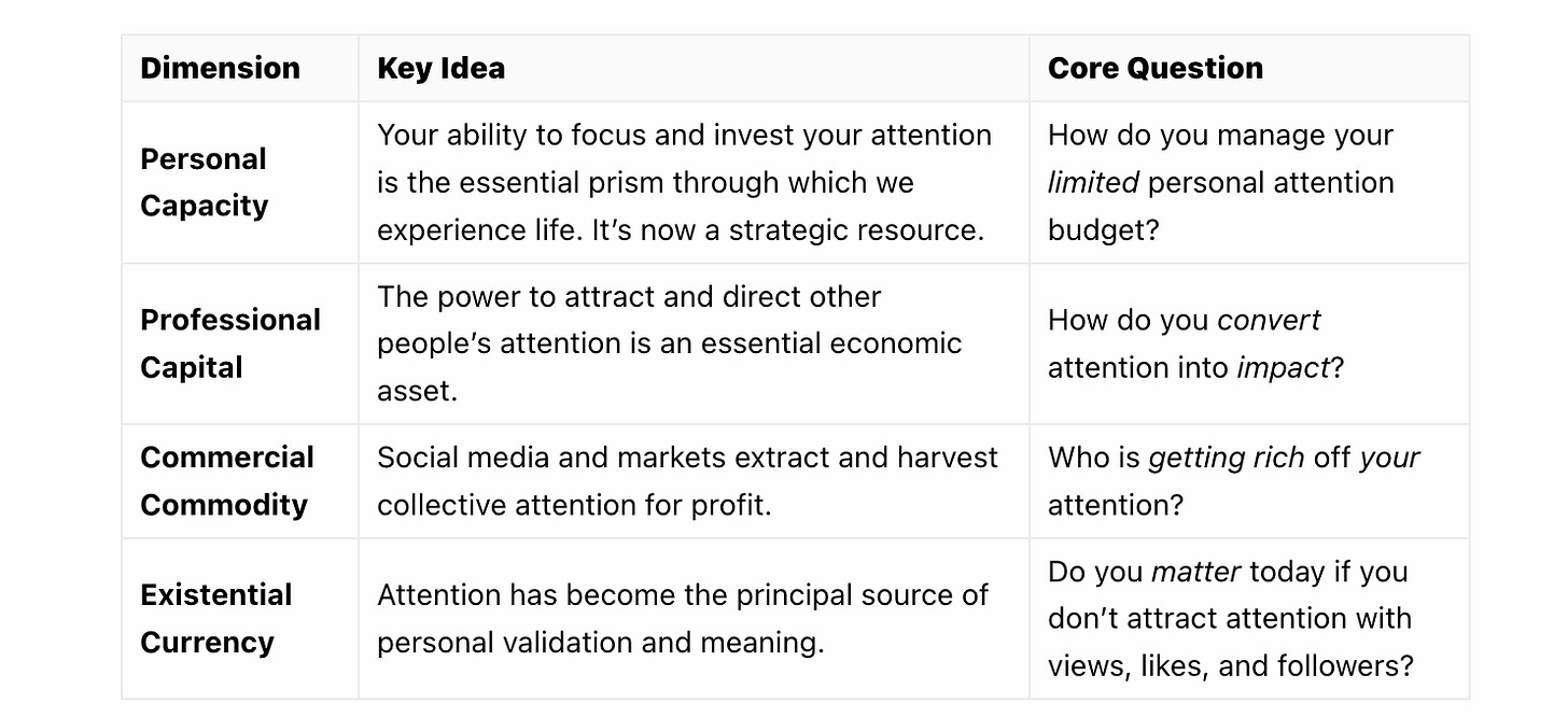 Collectively, this model reveals how attention has become both the most personal and the most economically productive resource of our time.